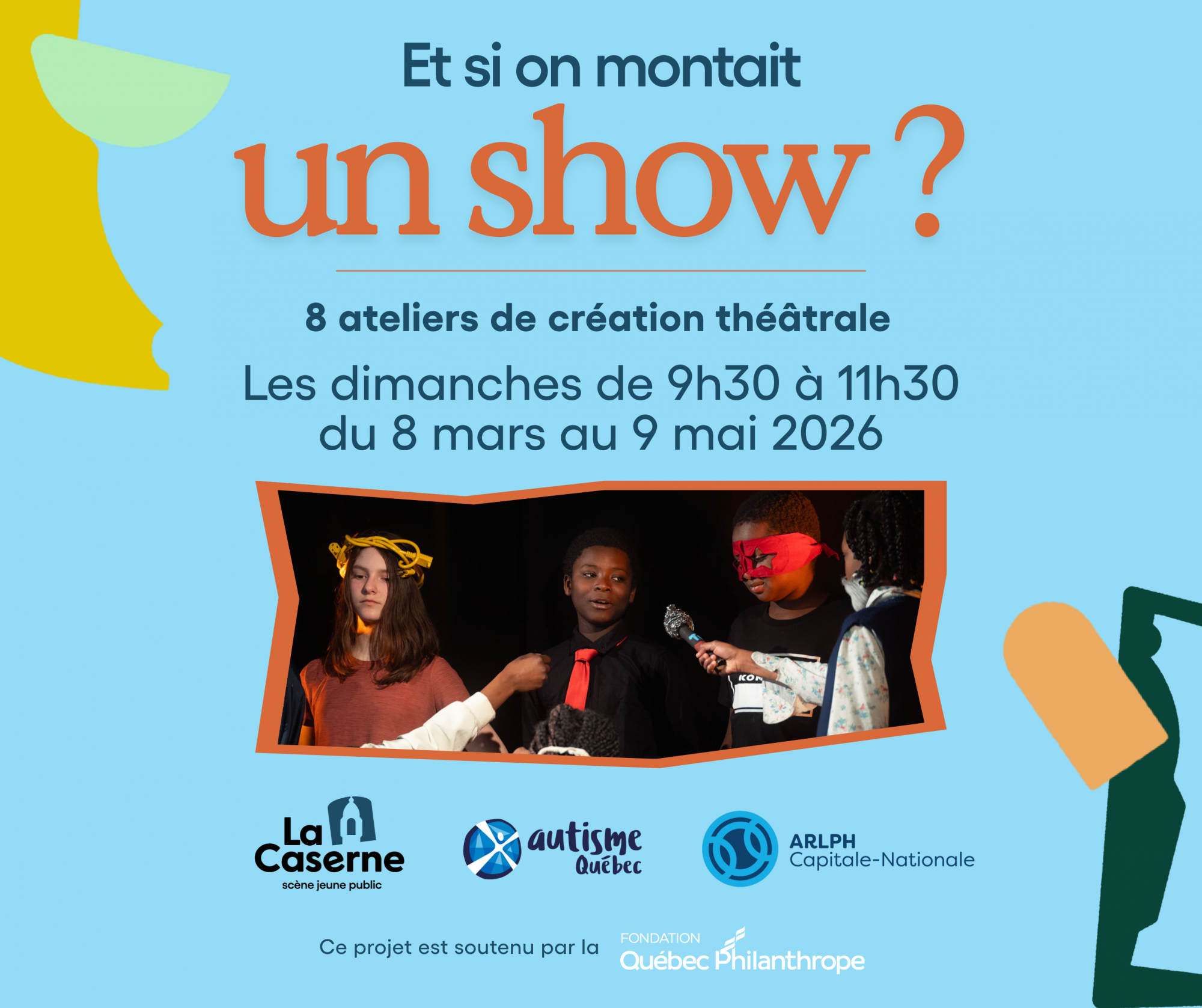 En collaboration avec La Caserne – scène jeune public, voici une série d'ateliers de théâtre pour un groupe de 10 enfants autistes de 7 à 12 ans. Ensemble, ils créeront un véritable spectacle : choix du thème, écriture des histoires, création des personnages et mise en scène… tout part de leur imagination! La création finale sera présentée sur la scène de La Caserne – scène jeune public, devant leurs familles, en première partie d’un spectacle professionnel.